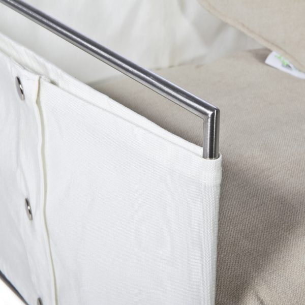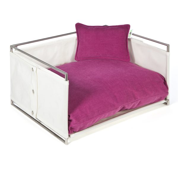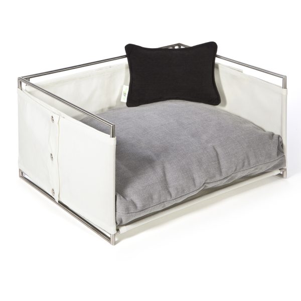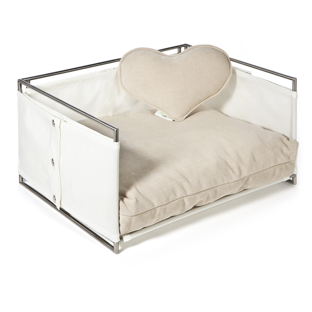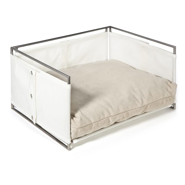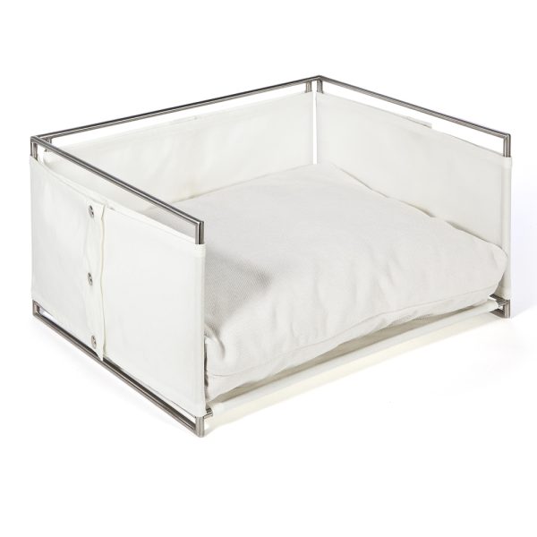 Adatta anche per gli ambienti esterni, la cuccia JACKIE, ha la struttura in tondino di acciaio satinato tagliato e saldato a mano, rivestita in tela di nylon. Il modello si compone e definisce con un cuscino in in rollofil rivestito in tessuto misto cotone e poliestere antimacchia, sfoderabile e lavabile.