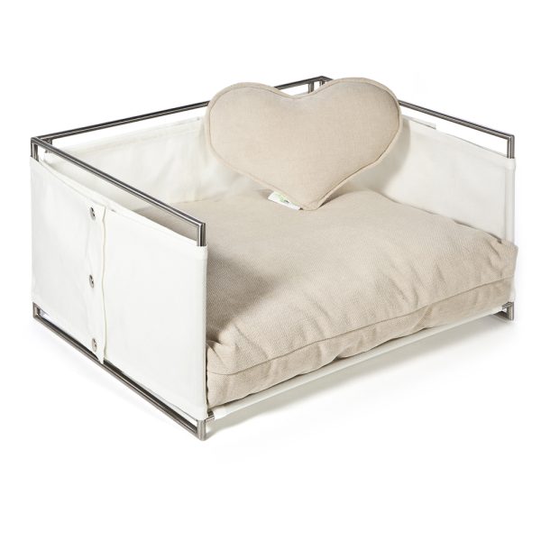 Adatta anche per gli ambienti esterni, la cuccia JACKIE, ha la struttura in tondino di acciaio satinato tagliato e saldato a mano, rivestita in tela di nylon. Il modello si compone e definisce con un cuscino in in rollofil rivestito in tessuto misto cotone e poliestere antimacchia, sfoderabile e lavabile. Il cuscino viene proposto nel colore bianco latte, a richiesta, è possibile fornire un secondo cuscino di diverso colore. Ogni pezzo è realizzato a mano singolarmente.